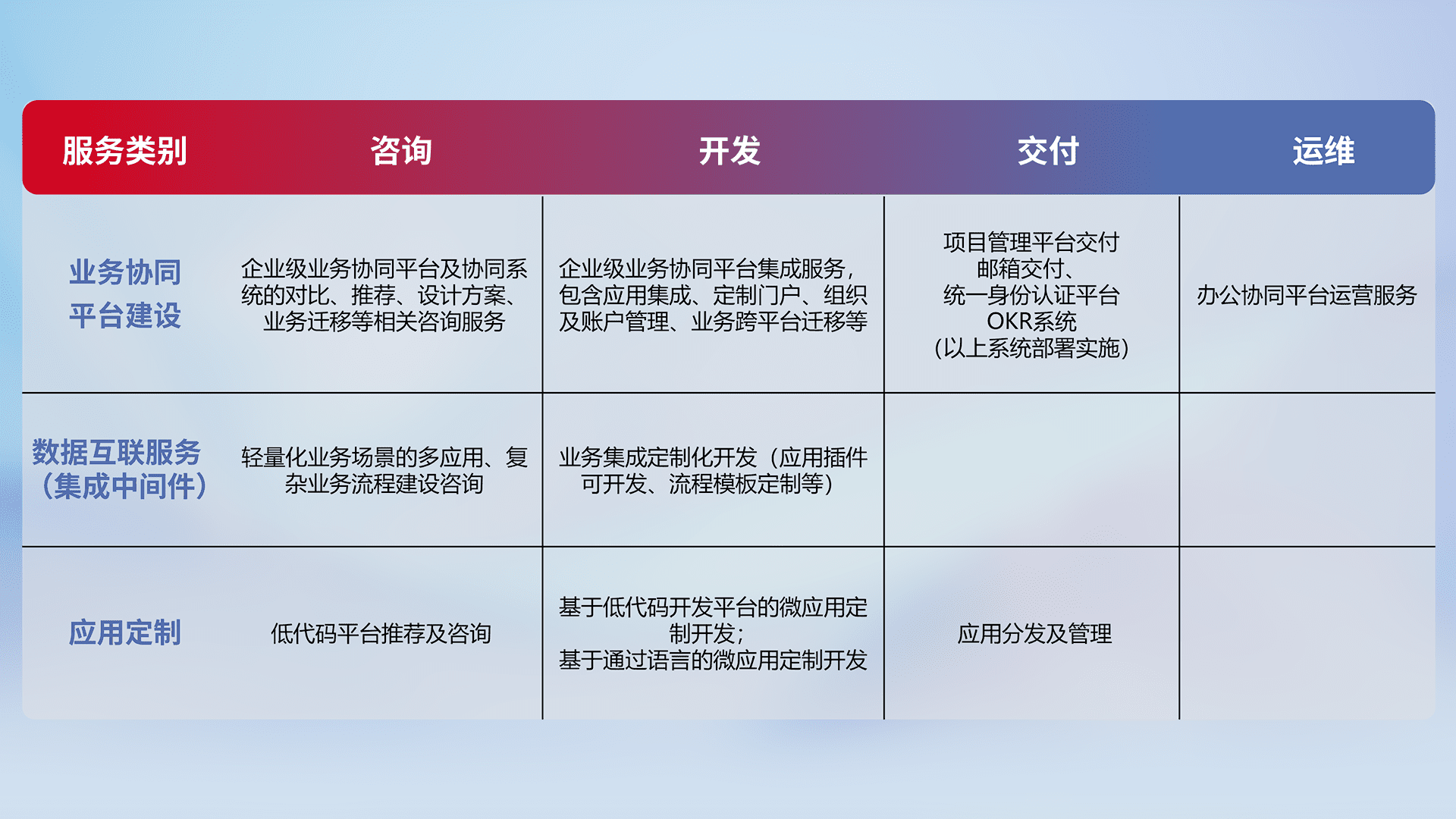 针对钉钉、、、企微、、、IDaas等平台级产品提供产品的规划、、、、方案、、、交付、、定制化开发等服务,,实现如统一协同办公、、、、智能客户服务、、、、混合会议管理、、、、智能数据查询、、、、等业务场景,,,实现数字化转型。。
